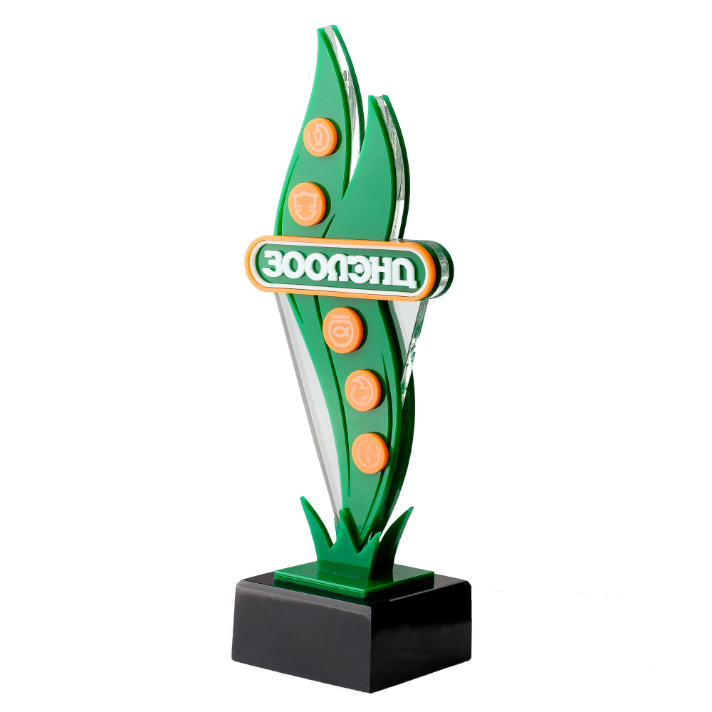 Приз состоит из основания и самой фигуры. Элементы статуэтки вырезаются лазером из трех слоев акрила. Толщина каждого слоя от 3 до 10 мм.