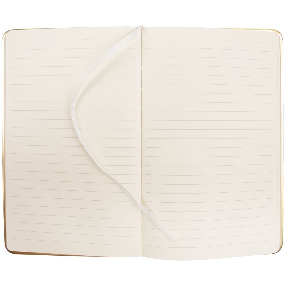 Изящный ежедневник с зауженным блоком и стильными деталями — металлической окантовкой на обложке и металлизированным обрезом.