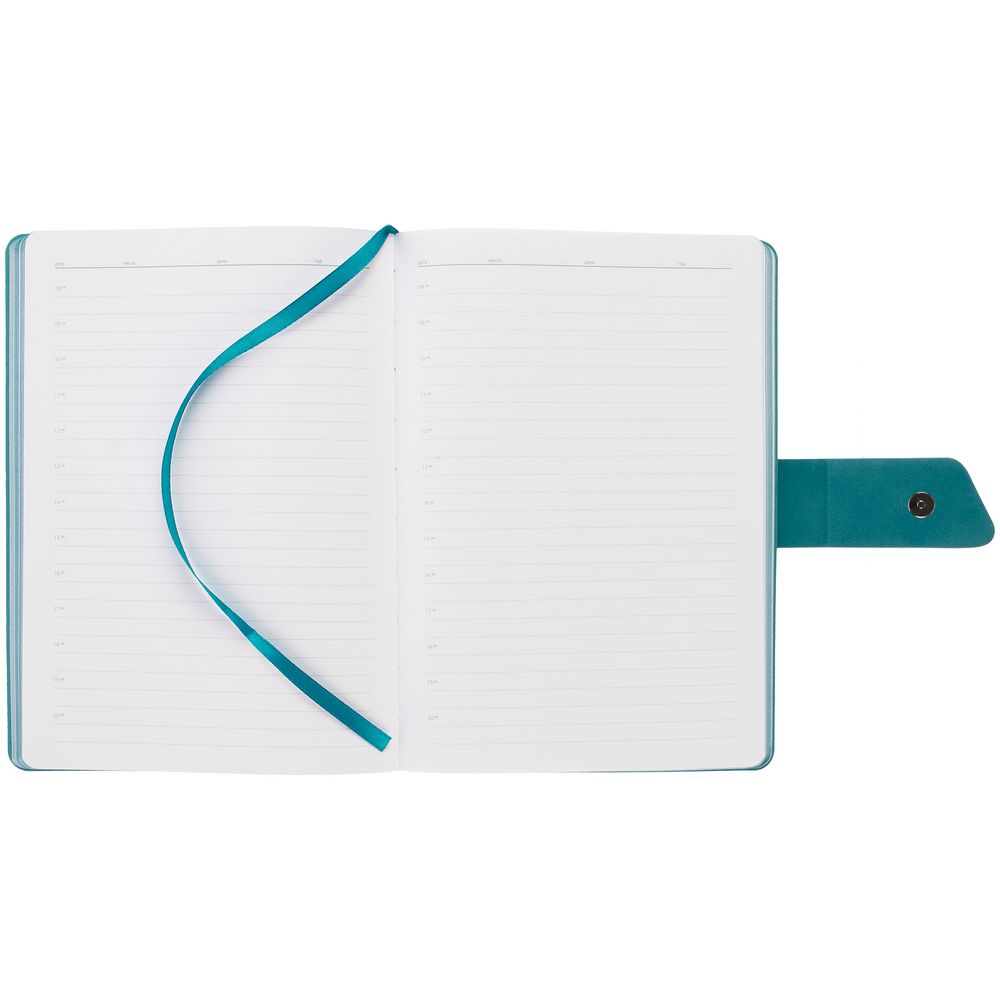 Ежедневник с гибкой обложкой, выполнен из материала La Fite, черный АА и Nubuck, цвет морской волны II, дополнен бирюзовым ляссе и хлястиком на кнопке.