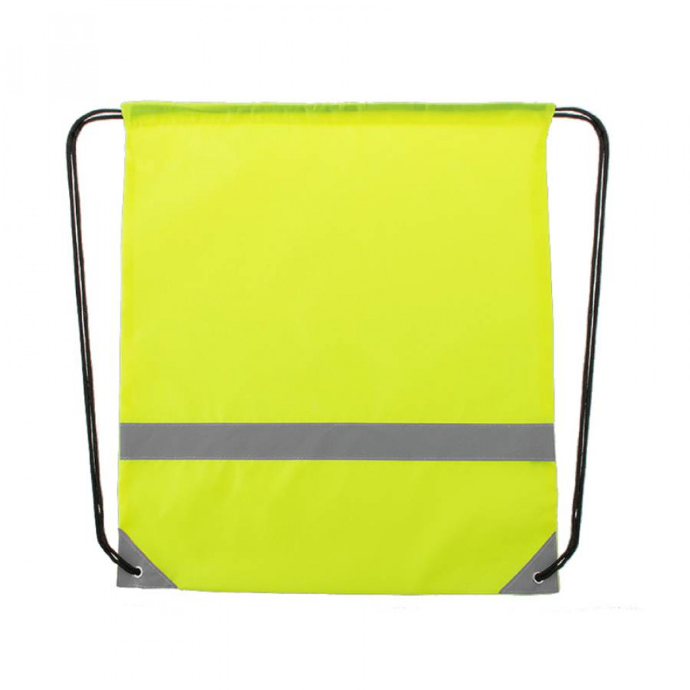Рюкзак из мягкого полиэстера 190T со светоотражающей полосой спереди. Самозакрывающиеся черные завязки и светоотражающие уголки, усиленные металлическими кольцами.