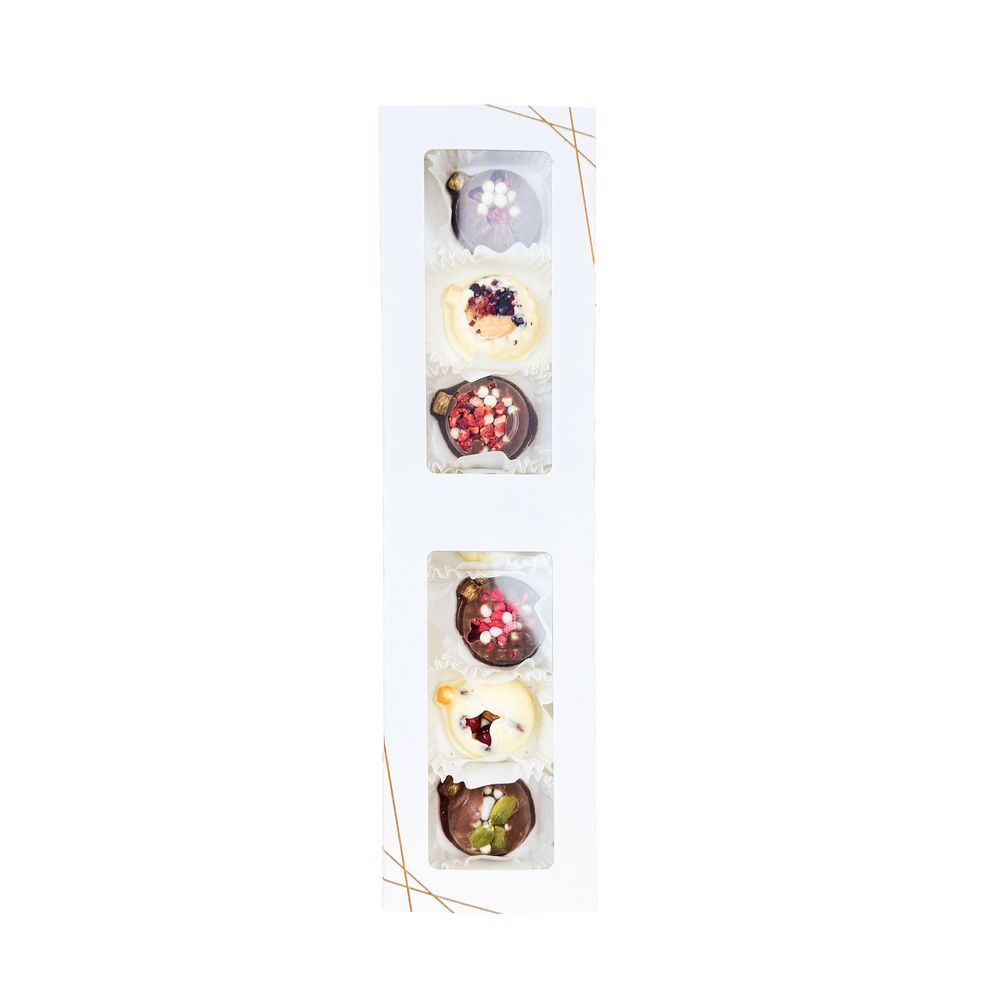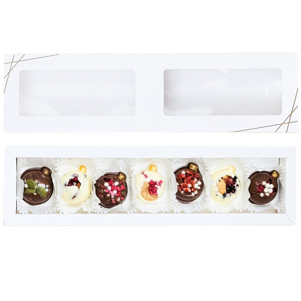 Набор включает шарики из молочного и белого шоколада с добавлением сублимированной малины, клубники и манго, кешью, миндаля, тыквенных семечек и воздушного риса. Прекрасное сочетание для праздничного настроения!