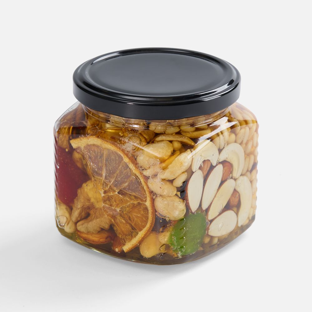 Медовый десерт с богатым составом: жареные орехи, яркие цукаты и полезные семена. Эффектный внешний вид делает продукт идеальным для подарка.