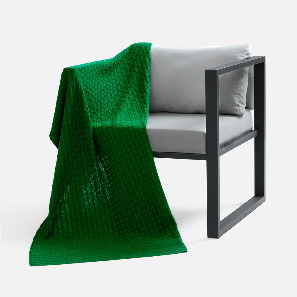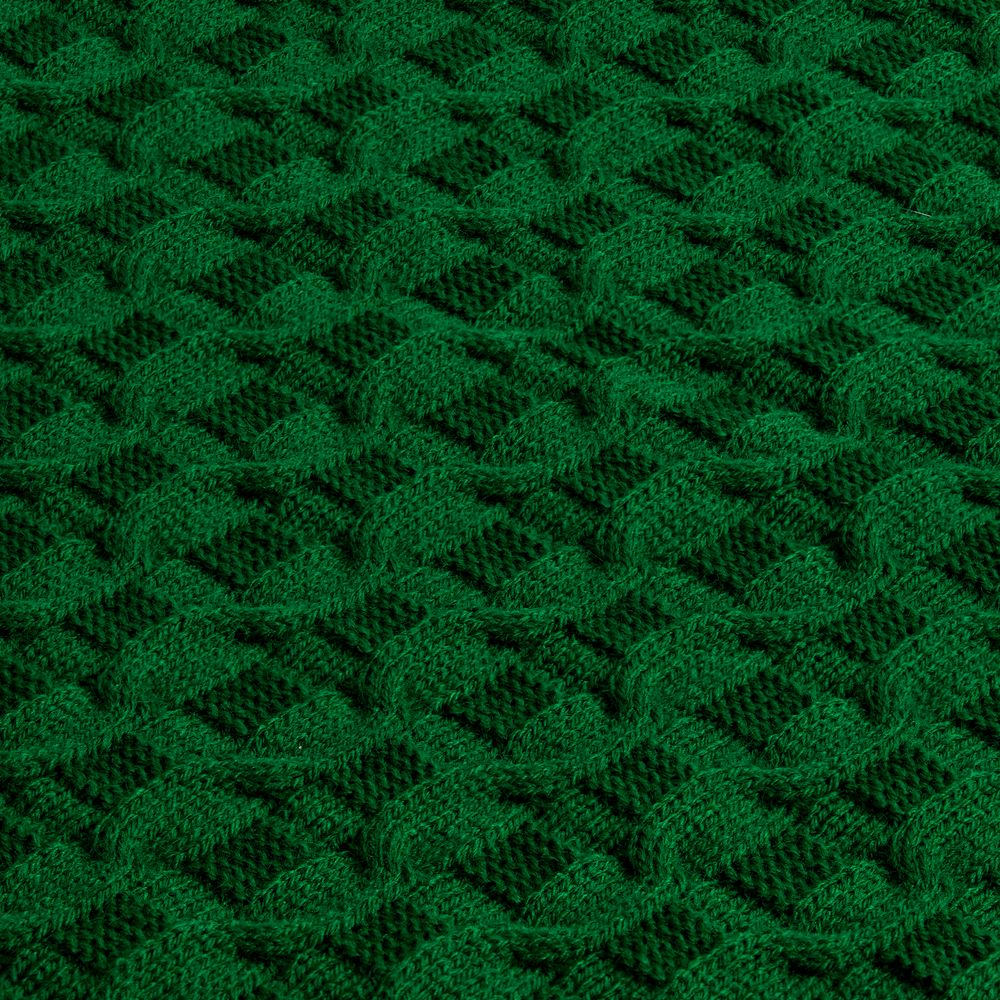 Модель: однотонный плед с фактурной вязкой, которая позволяет сделать его воздушным и объемным. Чередуя различные типы петель на гладком полотне, можно вывязать любую графику — логотип, текст, товарный знак.