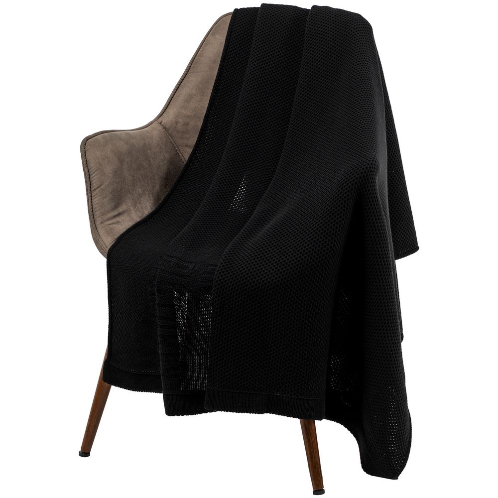 Модель: однотонный плед с фактурной вязкой, которая позволяет сделать его воздушным и объемным. Чередуя различные типы петель на гладком полотне, можно вывязать любую графику — логотип, текст, товарный знак.