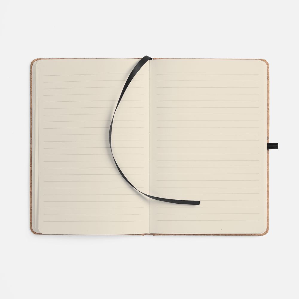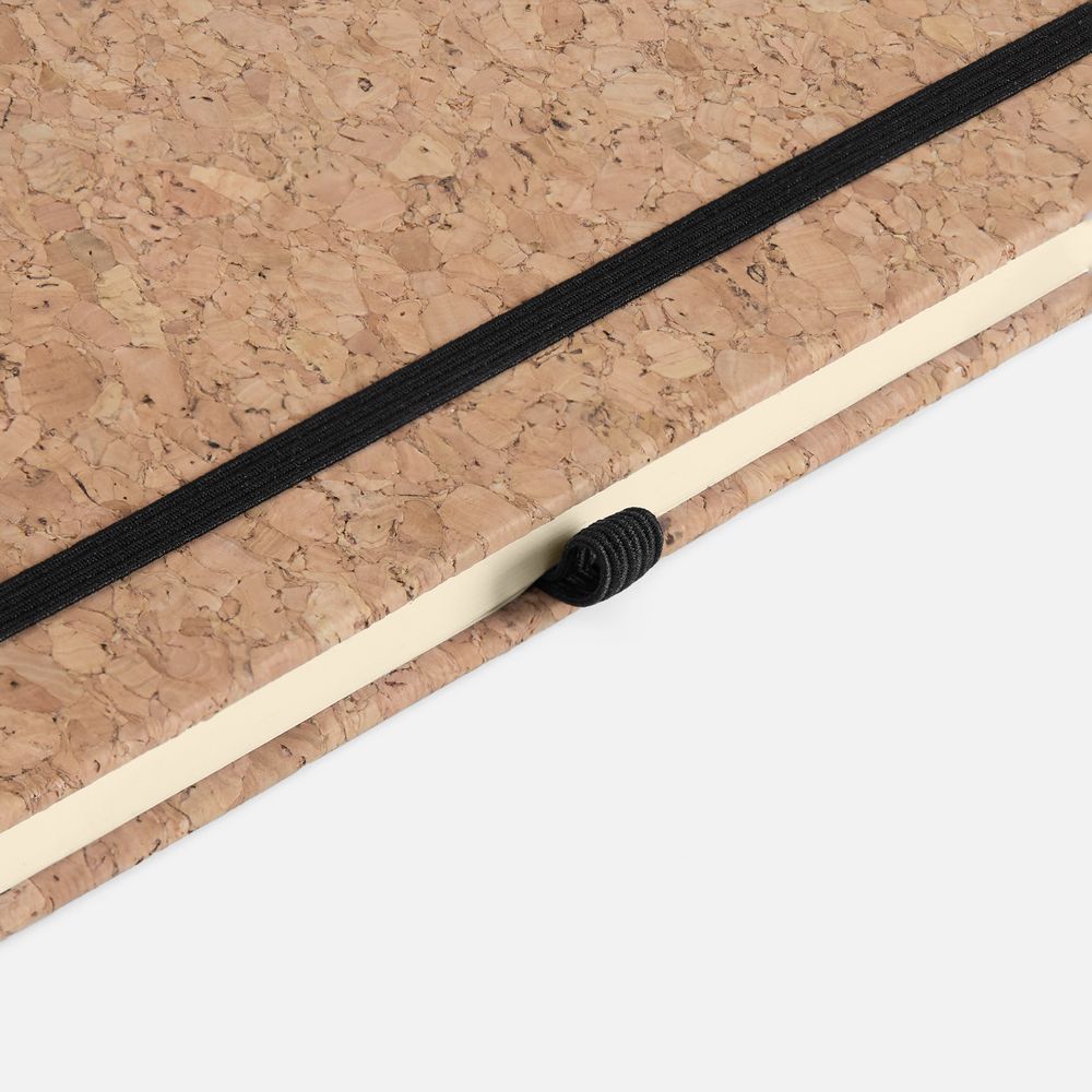 Блокнот в твердой обложке из натуральной неокрашенной пробки, дополнен цветными петлей-резинкой для ручки, ляссе и резинкой на обложку.