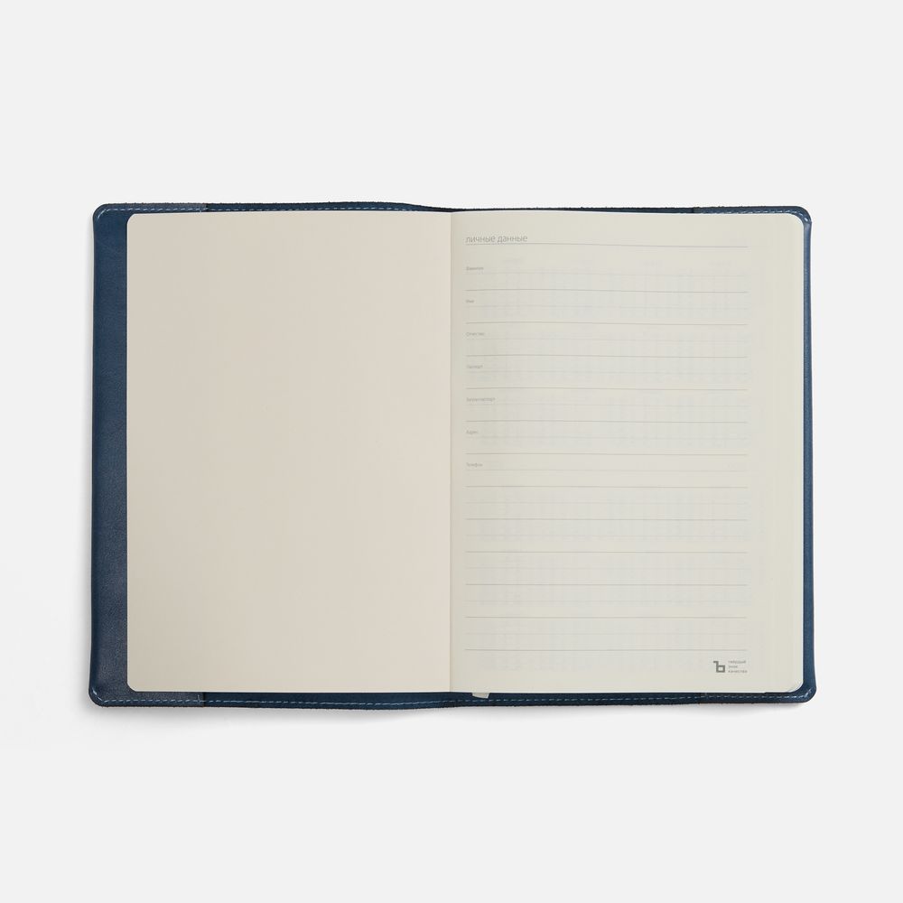 Ежедневник в мягкой суперобложке из натуральной кожи. Дополнен ляссе кремового цвета. Упакован в индивидуальную коробку.